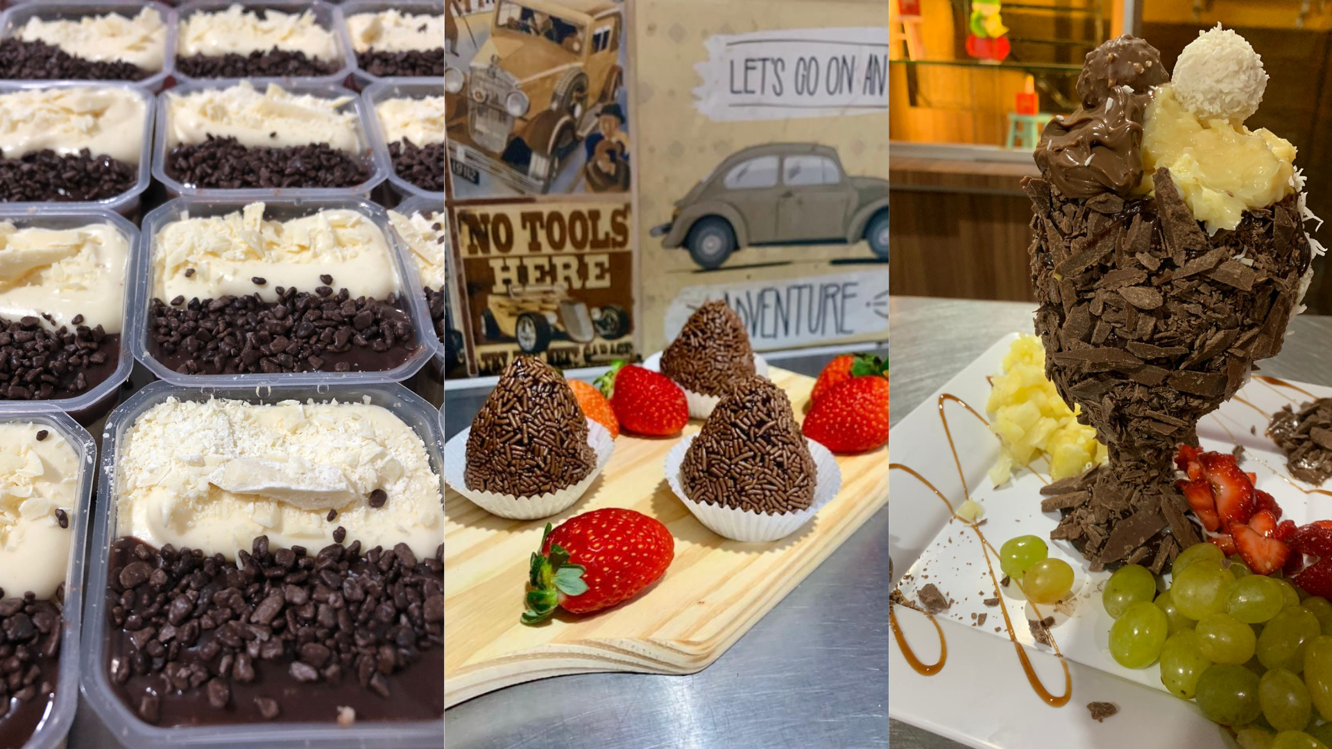 Deliciosa taça recheada com trufa, uma saborosa camada de chocolate ao leite, bombom sonho de valsa, sorvetes e frutas de sua preferência